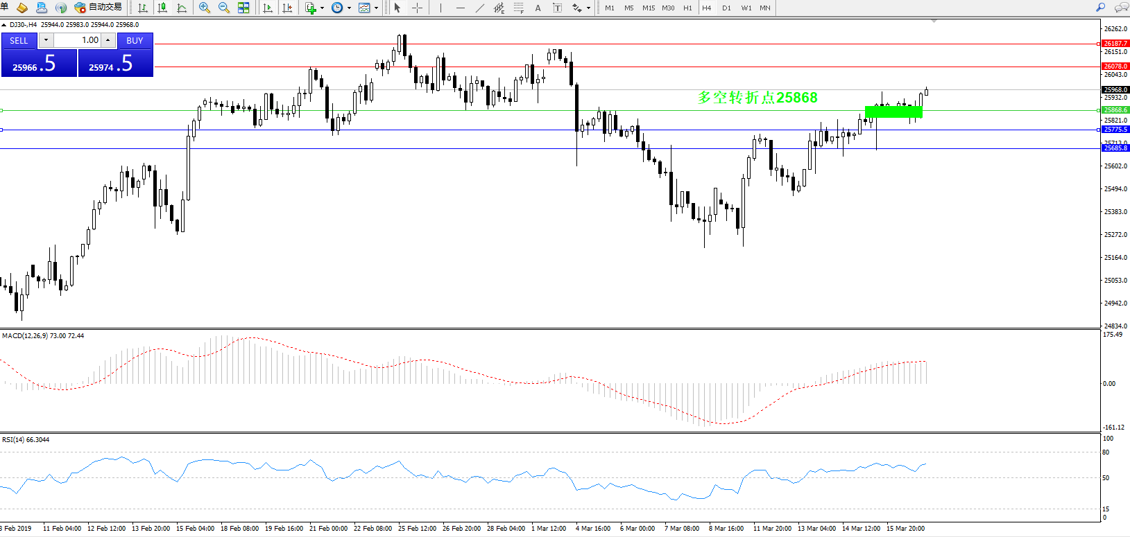道琼斯指数DJ30—— 4小时K线图显示: