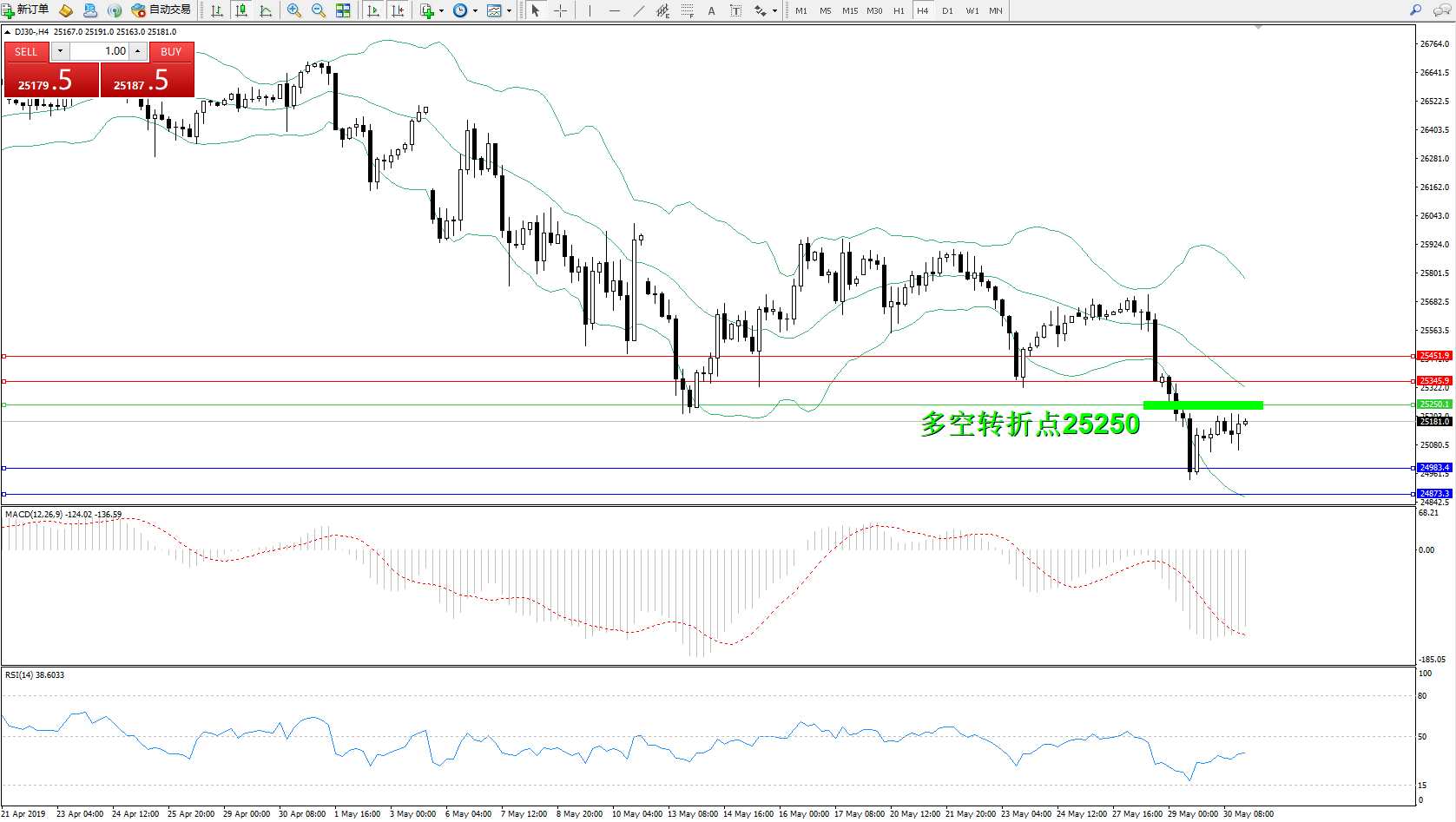 道琼斯指数DJ30—— 4小时K线图显示: