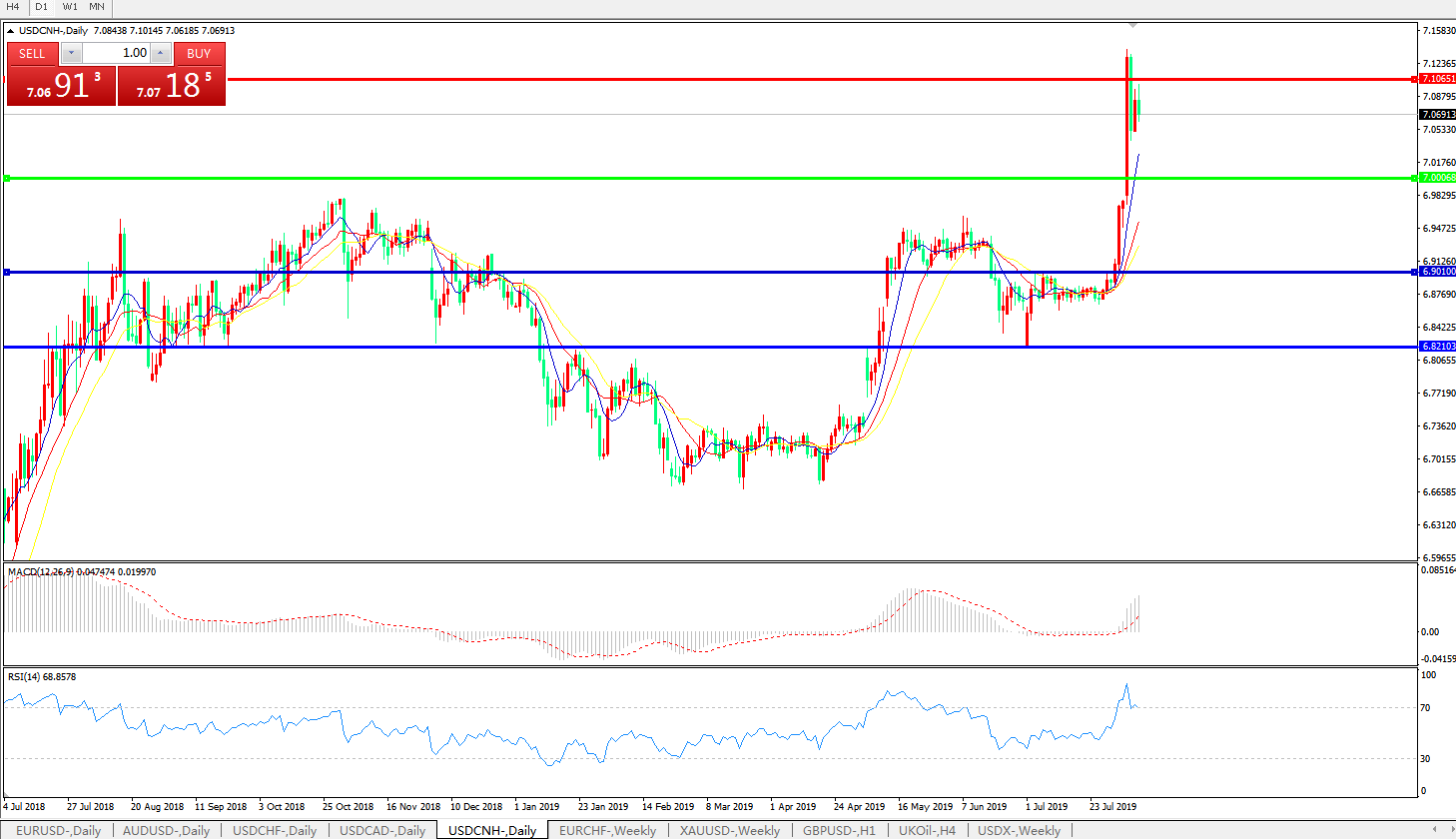 美元兑人民币USDCNH 日线图: