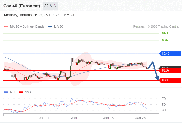 法国CAC指数期货 (Euronext) (G6) 当日内: 存在压力。