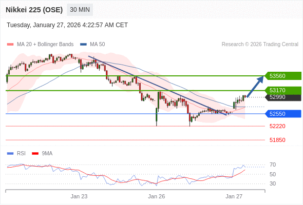 在 52550 之上,看涨,目标价位为 53170 ,然后为 53560 。