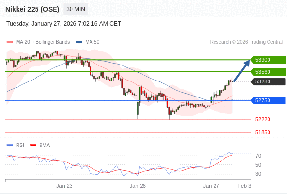 在 52750 之上,看涨,目标价位为 53560 ,然后为 53900 。