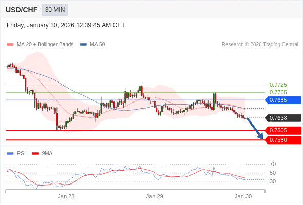 交易策略: 在 0.7685 之下,看跌,目标价位为 0.7605 ,然后为 0.7580 。