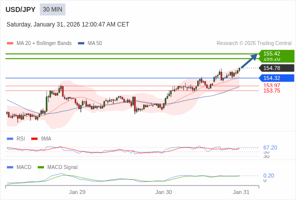 美元/日元 当日内 : 看涨,当 154.32 为支撑位。