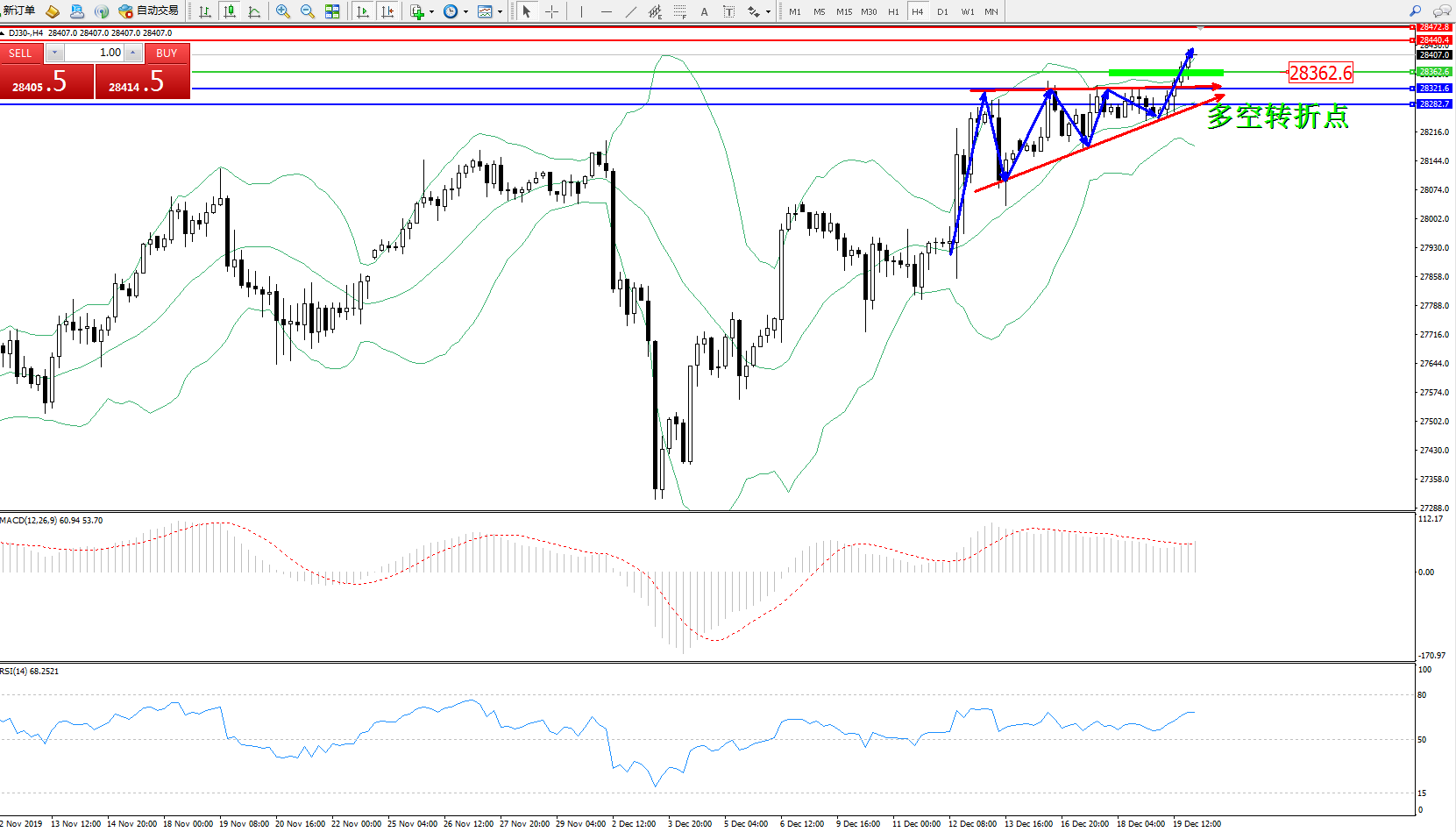 道琼斯指数DJ30—— 4小时K线图显示: