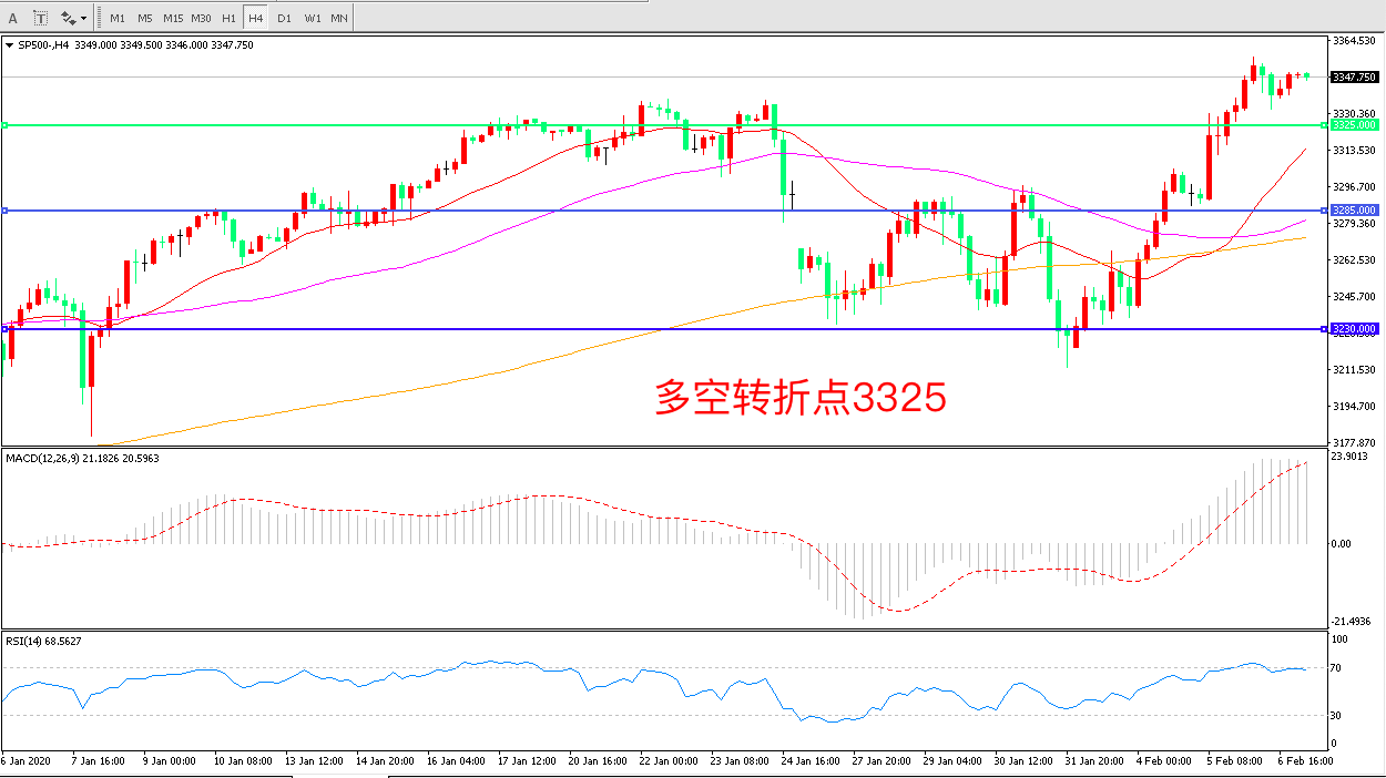4小时图看,标普长阳连续拉升,整体表现强势,短期均线拐头向上,MACD红柱增加,RSI指标走平,日内延续上行概率较大。