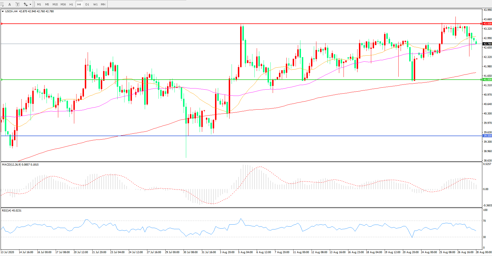 周四(8月27日),因飓风劳拉进入路易斯安那州,德克萨斯州墨西哥湾沿岸地区基本安然无恙,主要能源基础设施并未遭重大损失,市场情绪回落,美国WTI原油冲高回落,收报42.84美元/桶。从目前来看,飓风对原油生产的影响,仅为156万桶,很难从根本上改变供需平衡。
