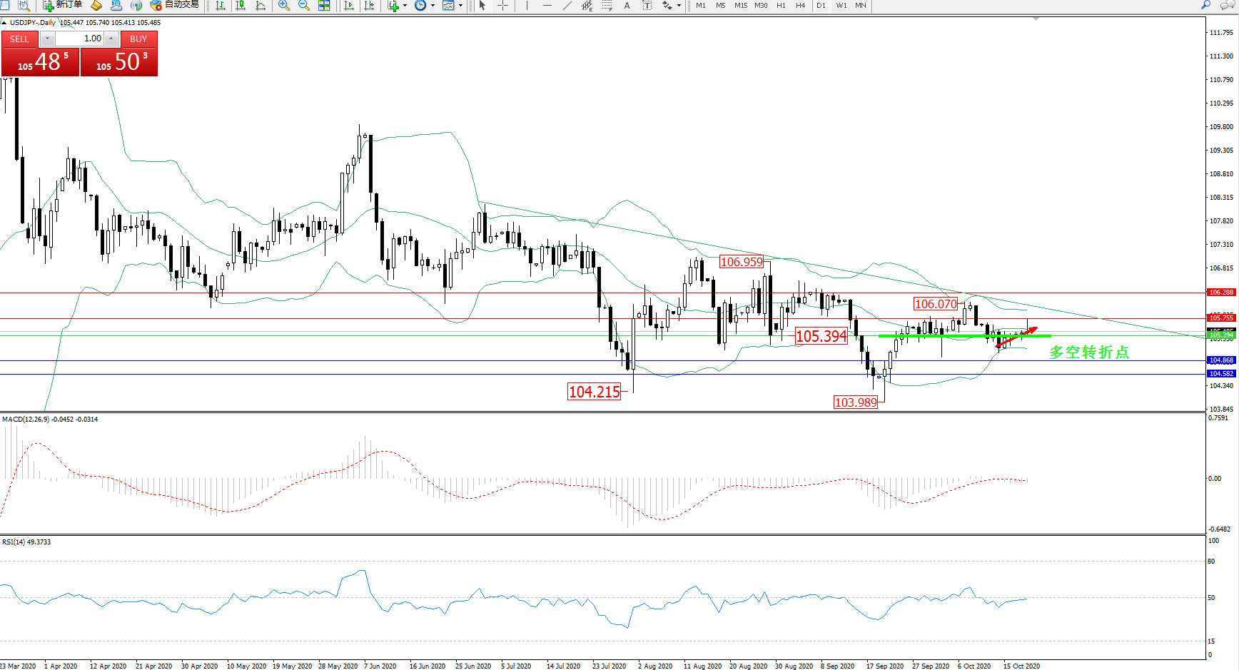 备选策略:105.394上方看涨,目标105.755、106.288
