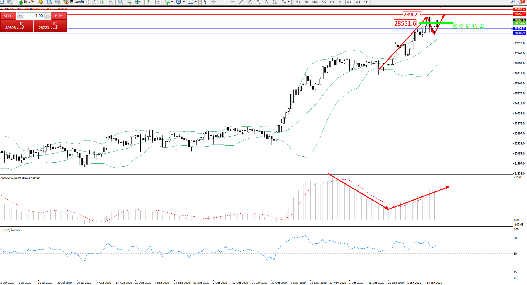技术点评:多头动力延续布林带指标通道中上轨区间持续震荡上扬态势良好,高位抵达28962位置节点后遇阻出现短暂回撤,然度多头动力未见减弱走势,有继续拉升上扬态势,布林带指标呈收口向上移动走势持续中,MACD指标处于多头区域维持震荡拉升走势中,RSI指标处于50均衡线上方多头区域为吹整理平移中;