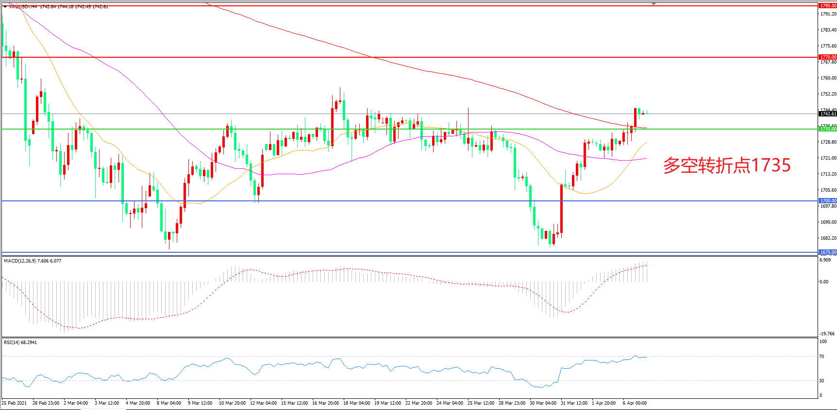 4小时图看,金价回踩1675后大幅反弹,短期表现十分强势,200周期均线被成功突破,1735成为短期多空分水岭,MACD红柱增加,RSI指标走平,日内震荡上行概率较大。