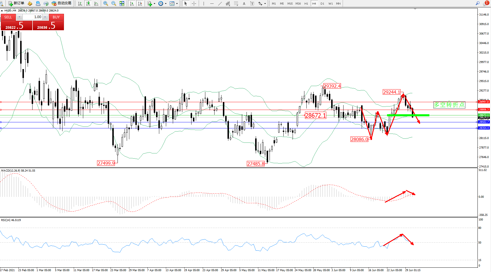 交易策略:28672下方看跌,目标28502、28354