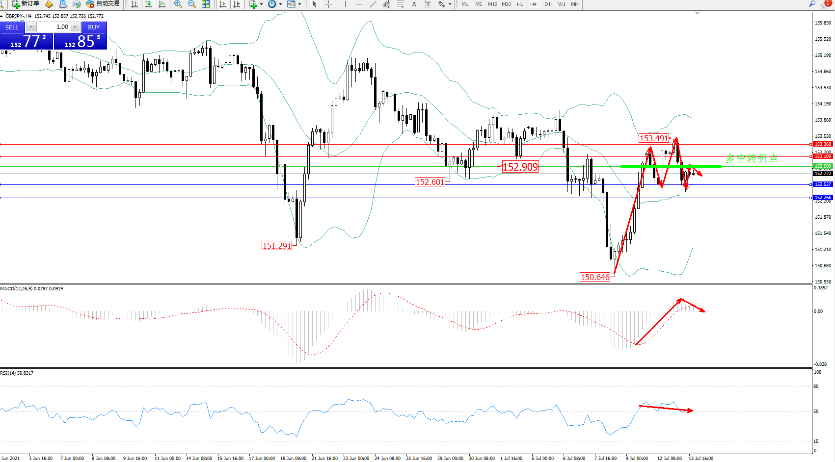 备选策略:152.909上方看涨,目标153.109、153.360