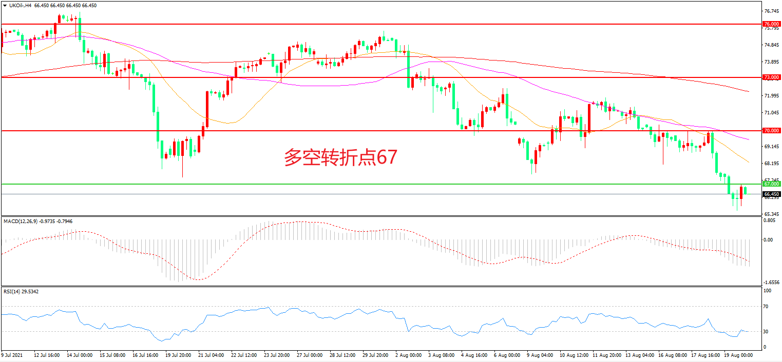 4小时图看,油价整体低开低走,整体表现较为低迷,均线系统逐渐下压,67美元成为短期阻力,MACD绿柱增加,RSI指标走平,油价震荡下行概率较大。