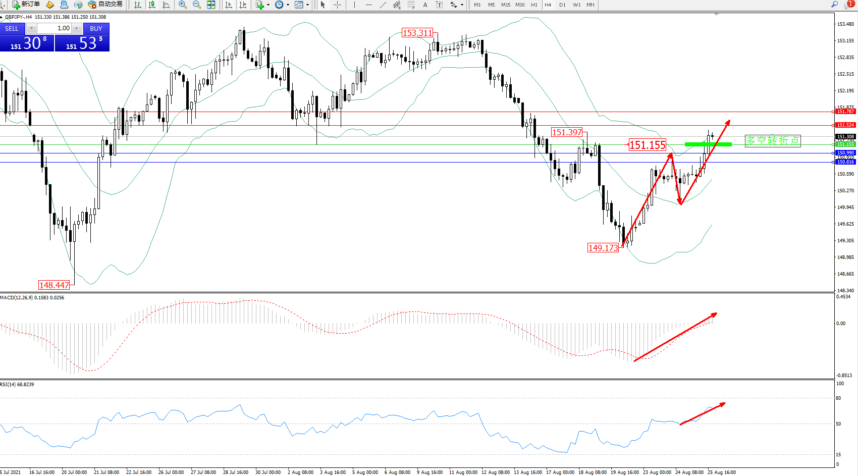 交易策略:151.155上方看涨,目标151.524、151.787