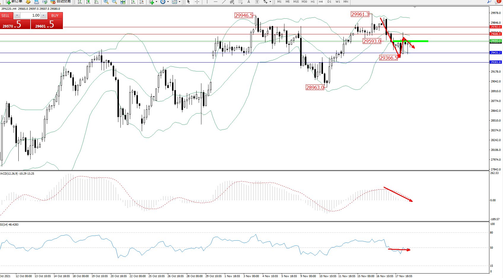 交易策略:29593下方看跌,目标29431、29301