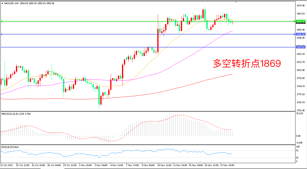 周四(11月18日),美联储高官的表态承认越来越多的领域正在出现通胀增长,对未来价格上涨的通胀预期成为多空博弈的胜负手,现货黄金冲高回落,收报1859.08美元/盎司。中期上看,黄金处在1845-1900的震荡区间内,随着整体波动的减小,黄金在技术面上出现了一个三角旗形态,这也是一种常见的突破形态,如果能够再度长阳突破,金价有望开启新一轮上涨。