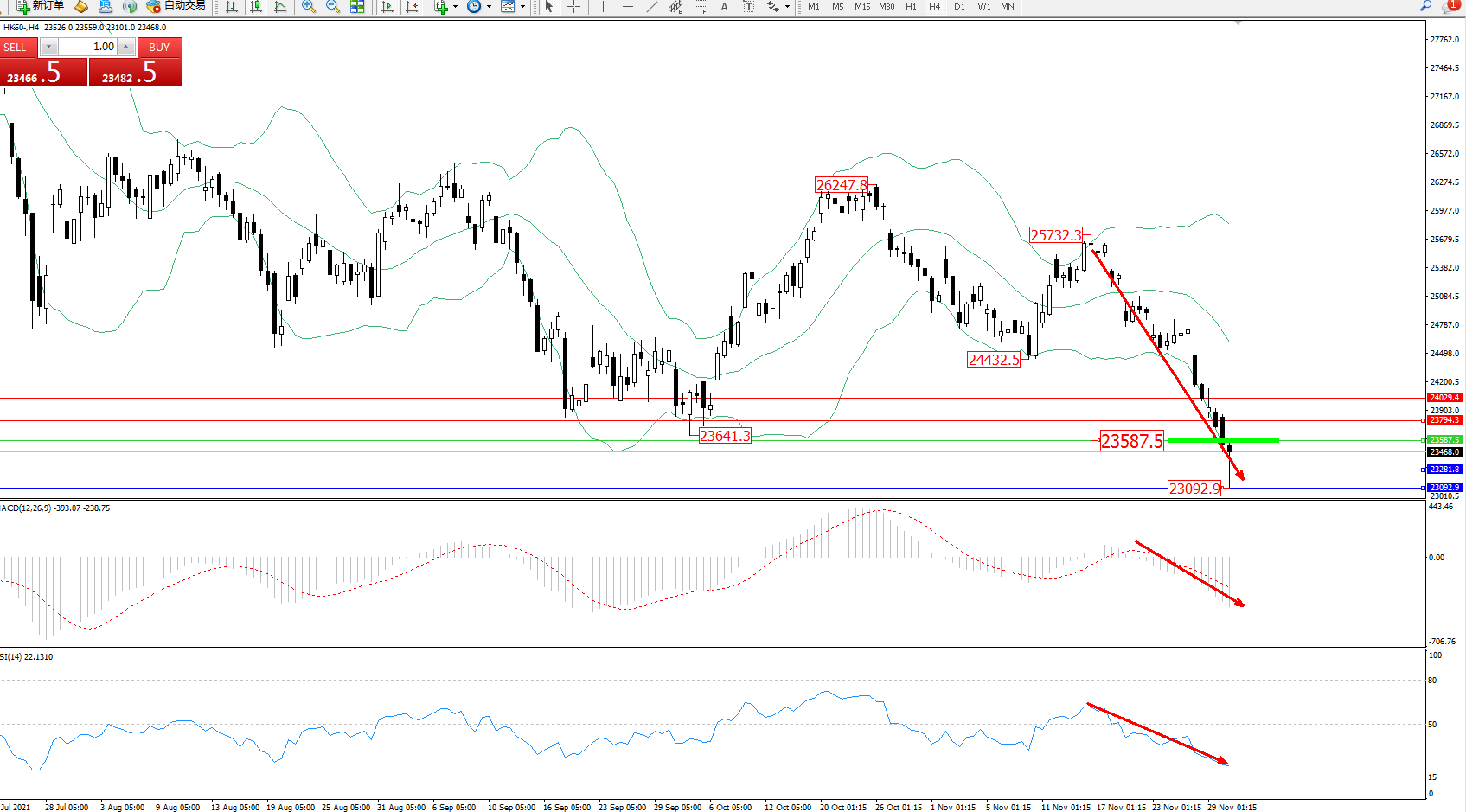 香港恒生指数11月30日(周二)收盘下跌376.98点,跌幅1.58%,报23475.26点;港股三大指数午后一度跌近3%,尾盘稍有回升,恒生科技指数跌1.16%。今日大市成交额为2238亿港元,南下资金逆势净流入26.16亿港元。此前强势的烟草概念股全线回调,燃气股大跌,中国燃气绩后重挫20%;受疫情影响的餐饮股、航空股、濠赌股持续低迷,新毒株或促海运价上涨,海运股延续昨日强势行情,半导体股、锂电池股、体育用品股小幅上涨。周焯华被批捕,太阳城集团、凯升控股复牌均暴跌。
