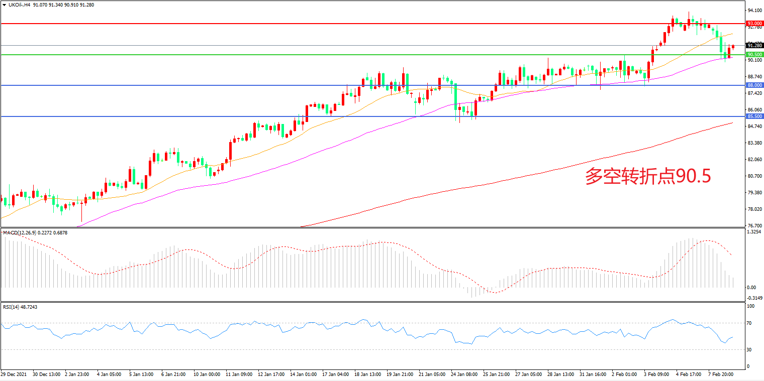4小时图看,油价受阻于93美元后大幅回落,上行趋势暂缓,均线系统拐头向上,90.5美元成为多空分水岭,MACD红柱缩短,RSI指标走平,日内延续震荡概率较大。