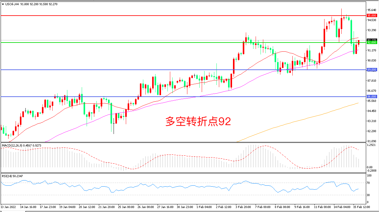周二(2月15日),普京表态同意继续循着外交道路努力后,俄罗斯将从乌克兰边境撤离部分部队,地缘局势缓和导致油价回落,美国WTI原油破位下行后收报92.10美元/桶。目前地缘政治因素短期有所降温,但俄乌的冲突仍有炒作空间炒作,因为即便是俄罗斯部分军队已经回归原驻地,但并不会大规模的撤军,一旦市场再次紧张起来,油价仍然有可能再度反弹。