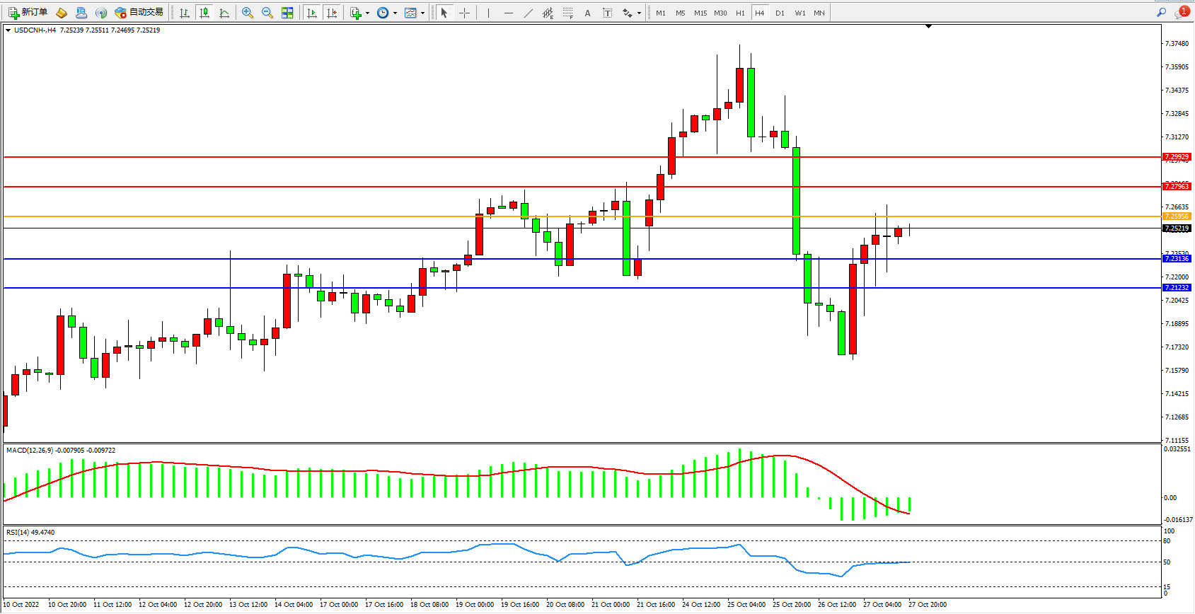 美元人民币USDCNH——4小时K线图显示: