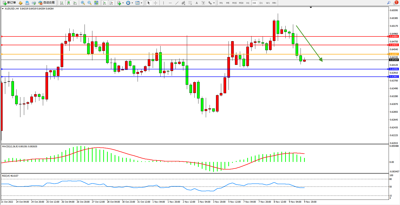 澳元美元AUDUSD——4小时K线图显示: