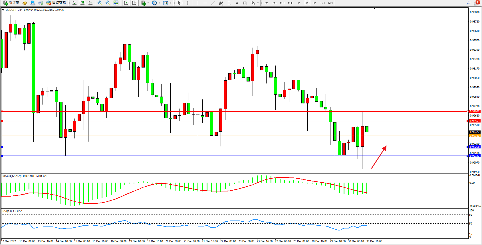 美元瑞郎USDCHF——4小时K线图显示: