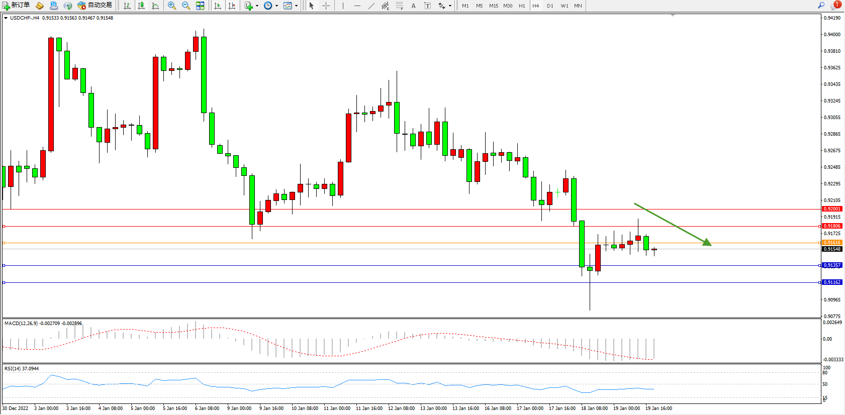 美元瑞郎USDCHF——4小时K线图显示:
