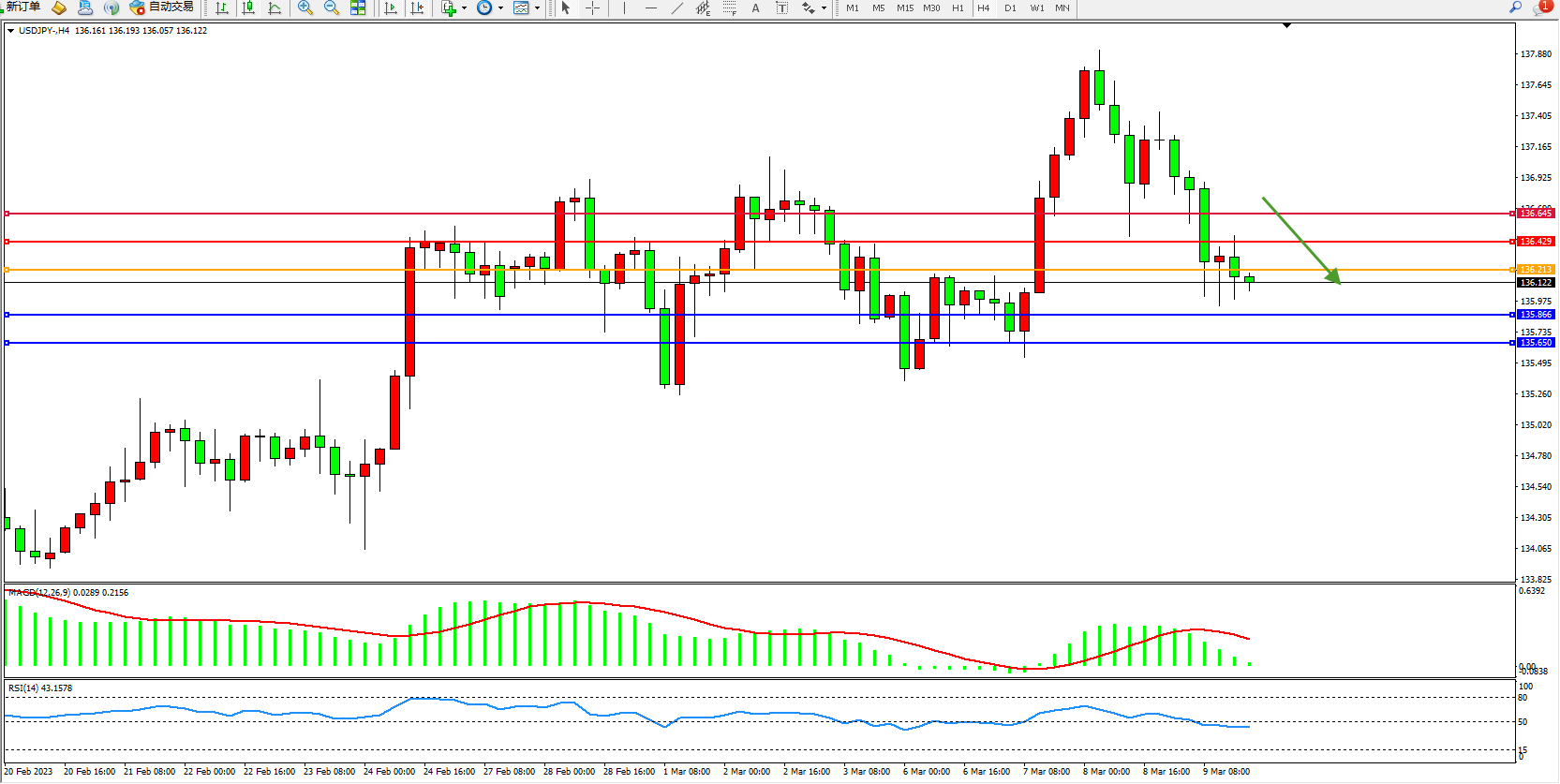交易策略:136.213下方看跌,目标135.866  135.650