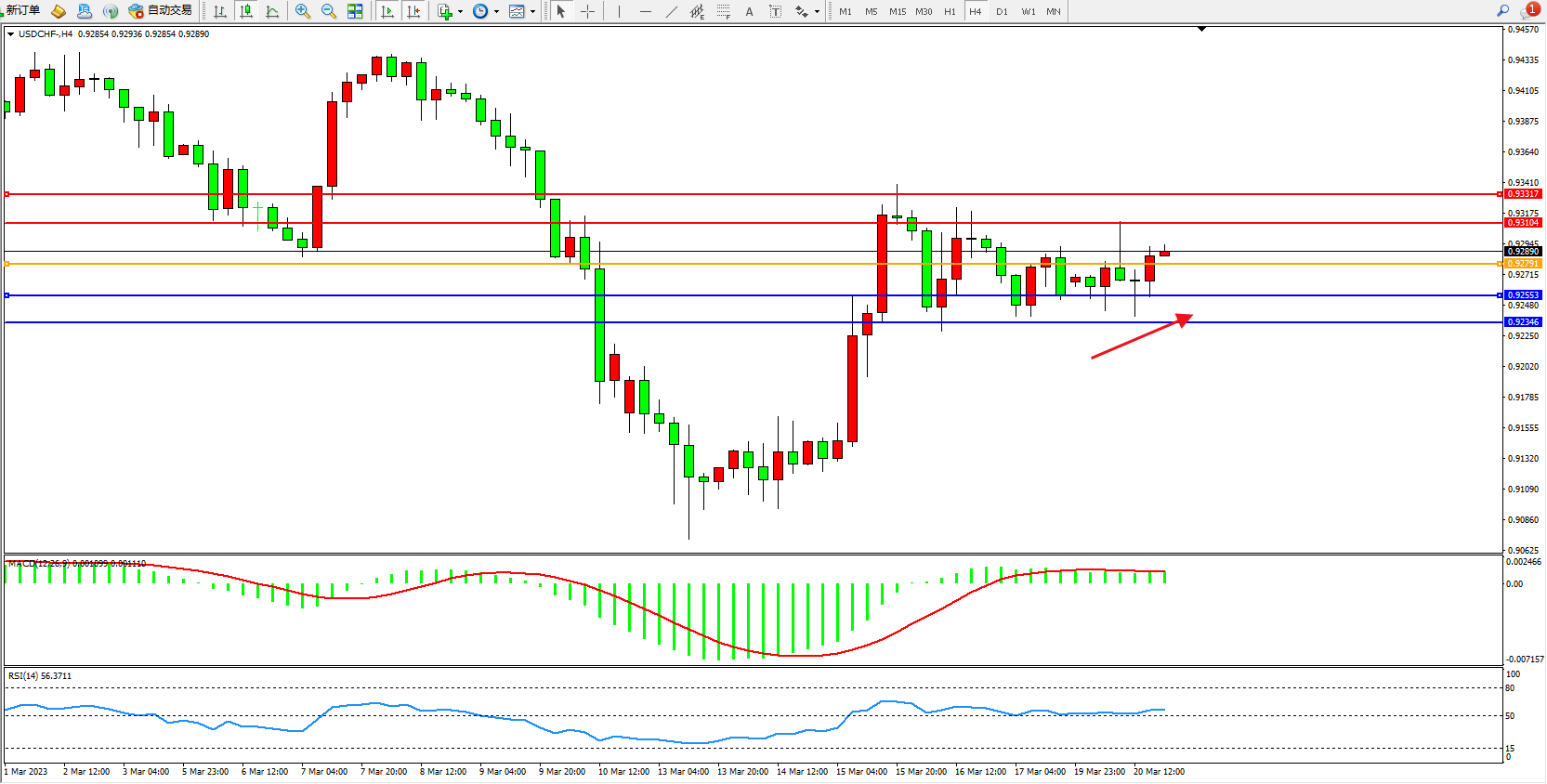 4小时图看:短期维持窄幅整理,市场整体处于偏弱势窄幅震荡,MACD指标处于0轴线上側弱势徘徊,RSI指标处于50均衡线上側窄幅整理;