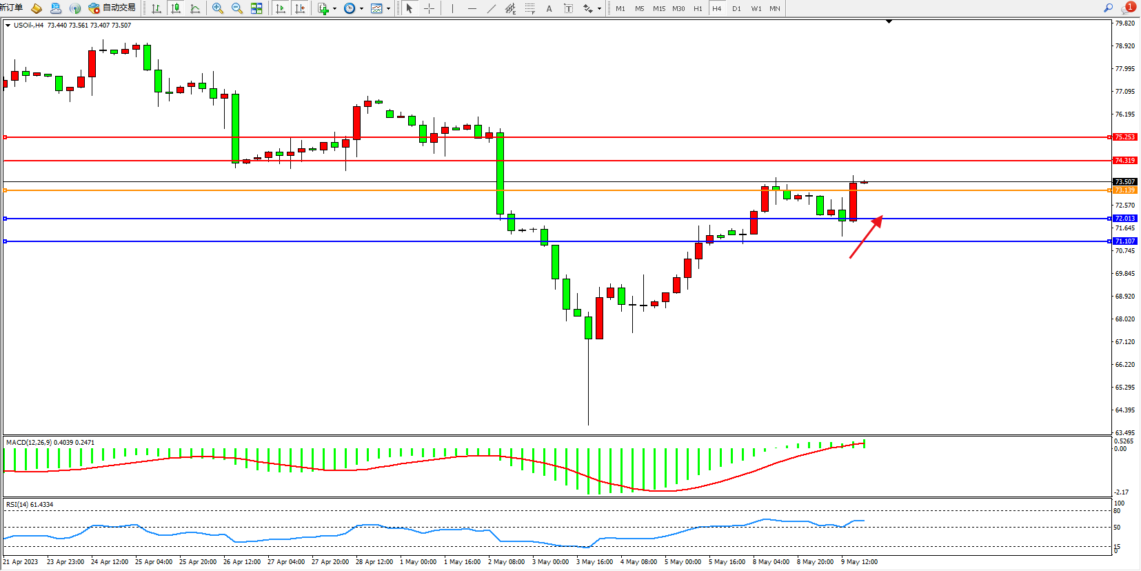 4小时图看:短期多头动力急速拉升,市场看涨情绪涌现,MACD指标处于0轴线上側弱势整理,RSI指标处于50均衡线上側弱势徘徊;