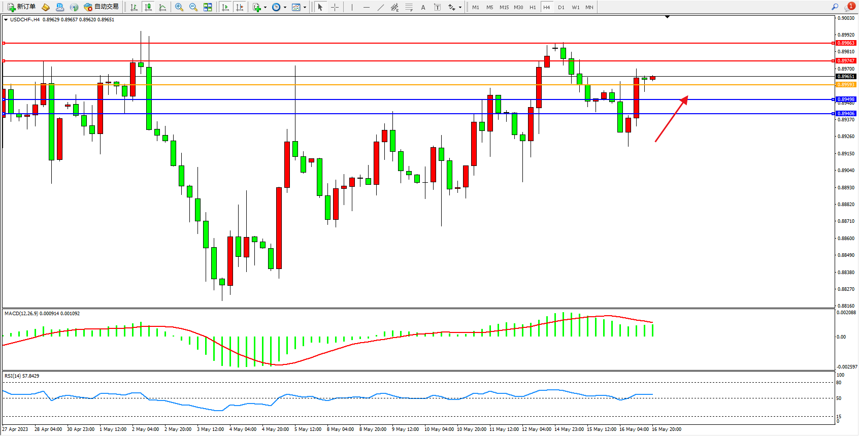 美元瑞郎USDCHF——4小时K线图显示: