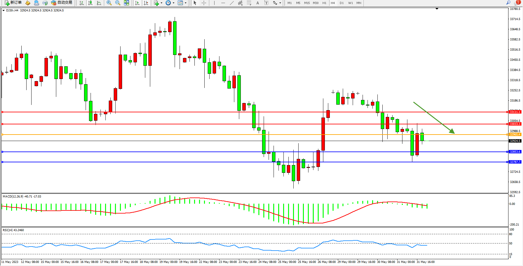 交易策略:32965下方看跌,目标32853 32787