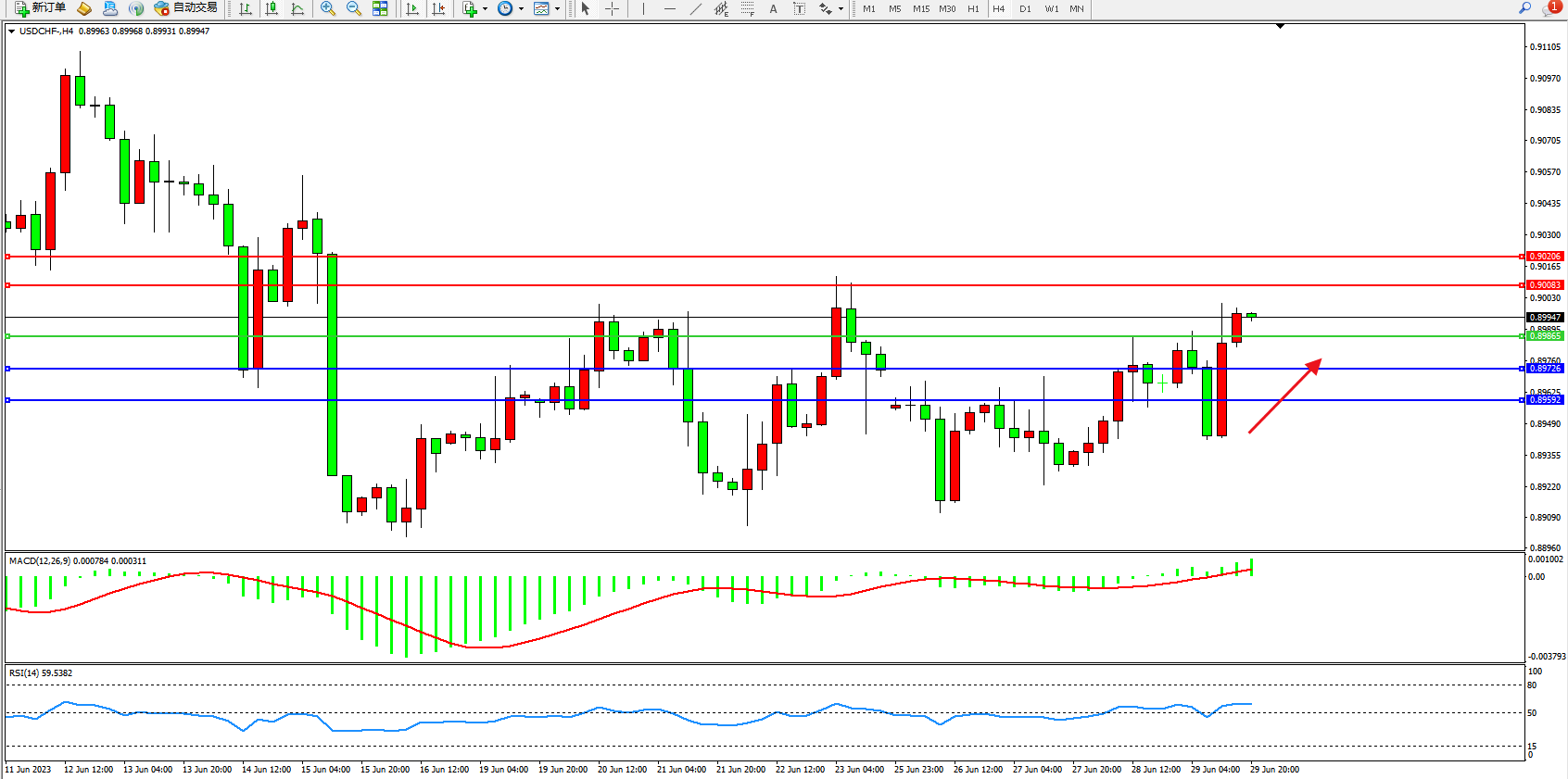 美元瑞郎USDCHF——4小时K线图显示: