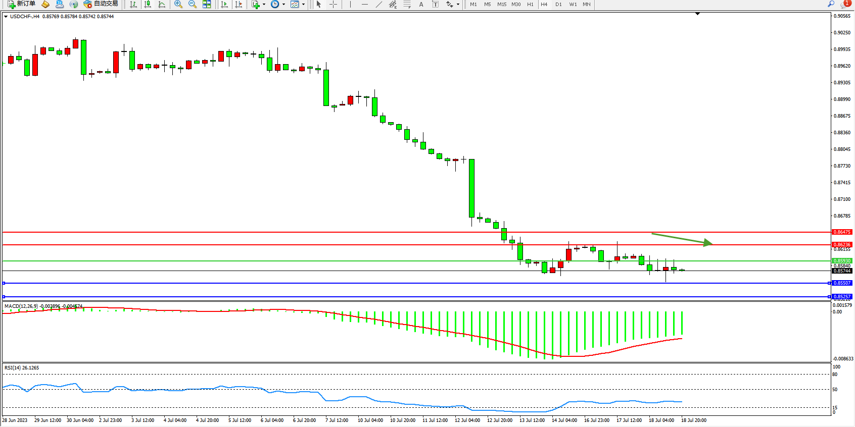 美元瑞郎USDCHF——4小时K线图显示: