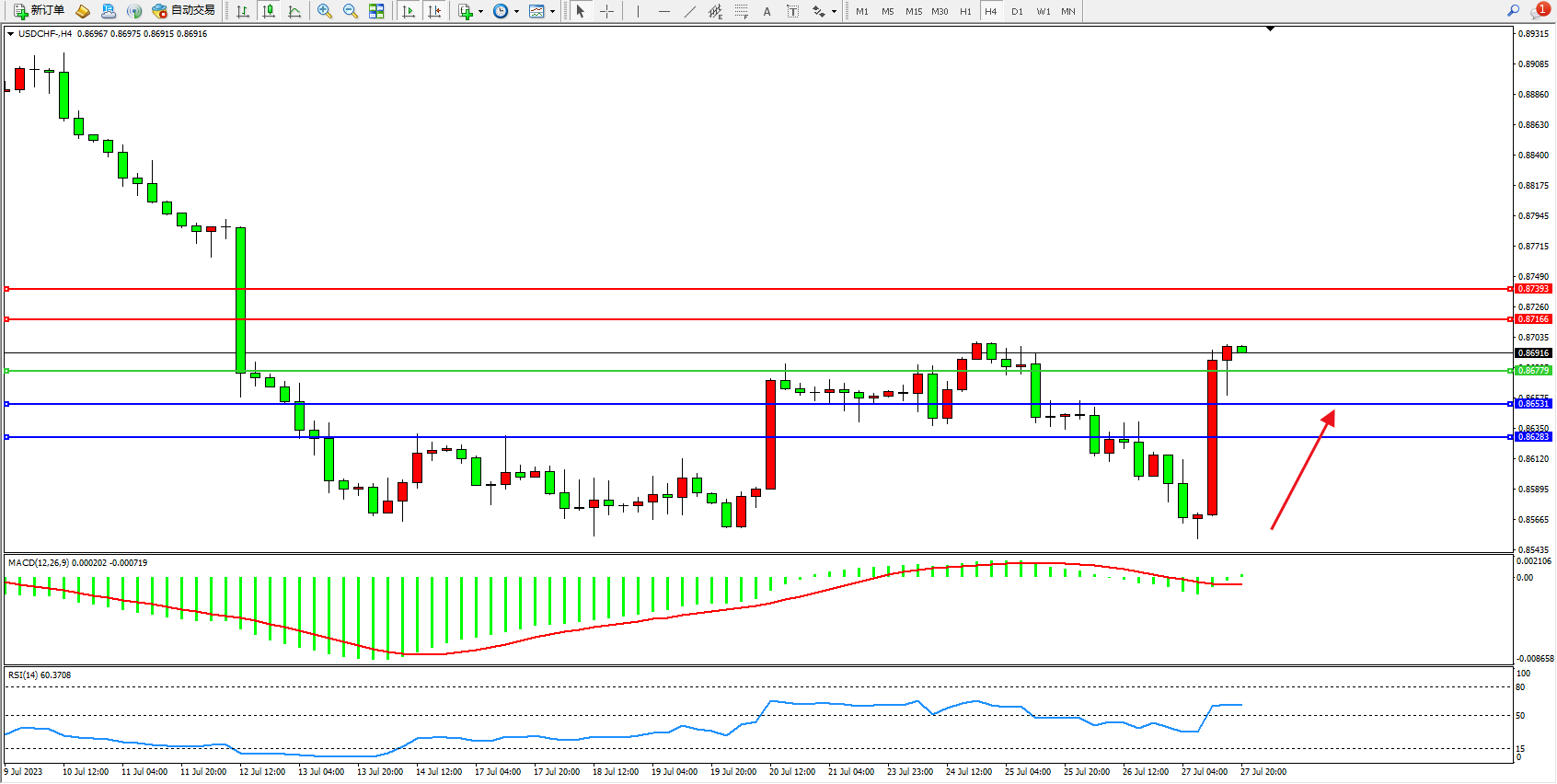 美元瑞郎USDCHF——4小时K线图显示: