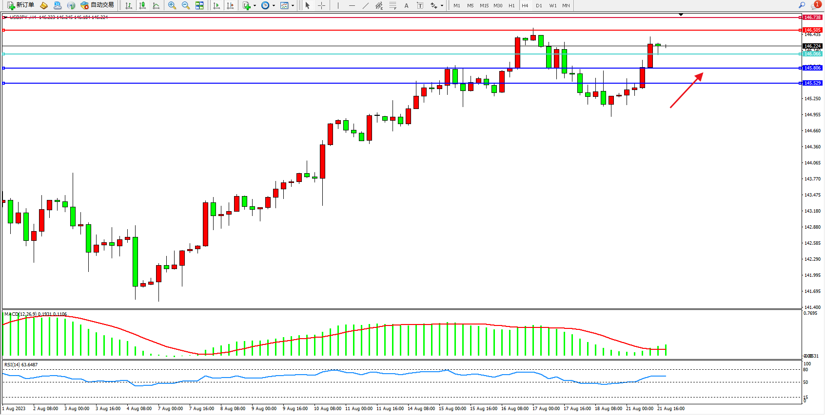 交易策略:146.066上方看涨,目标146.505 146.739