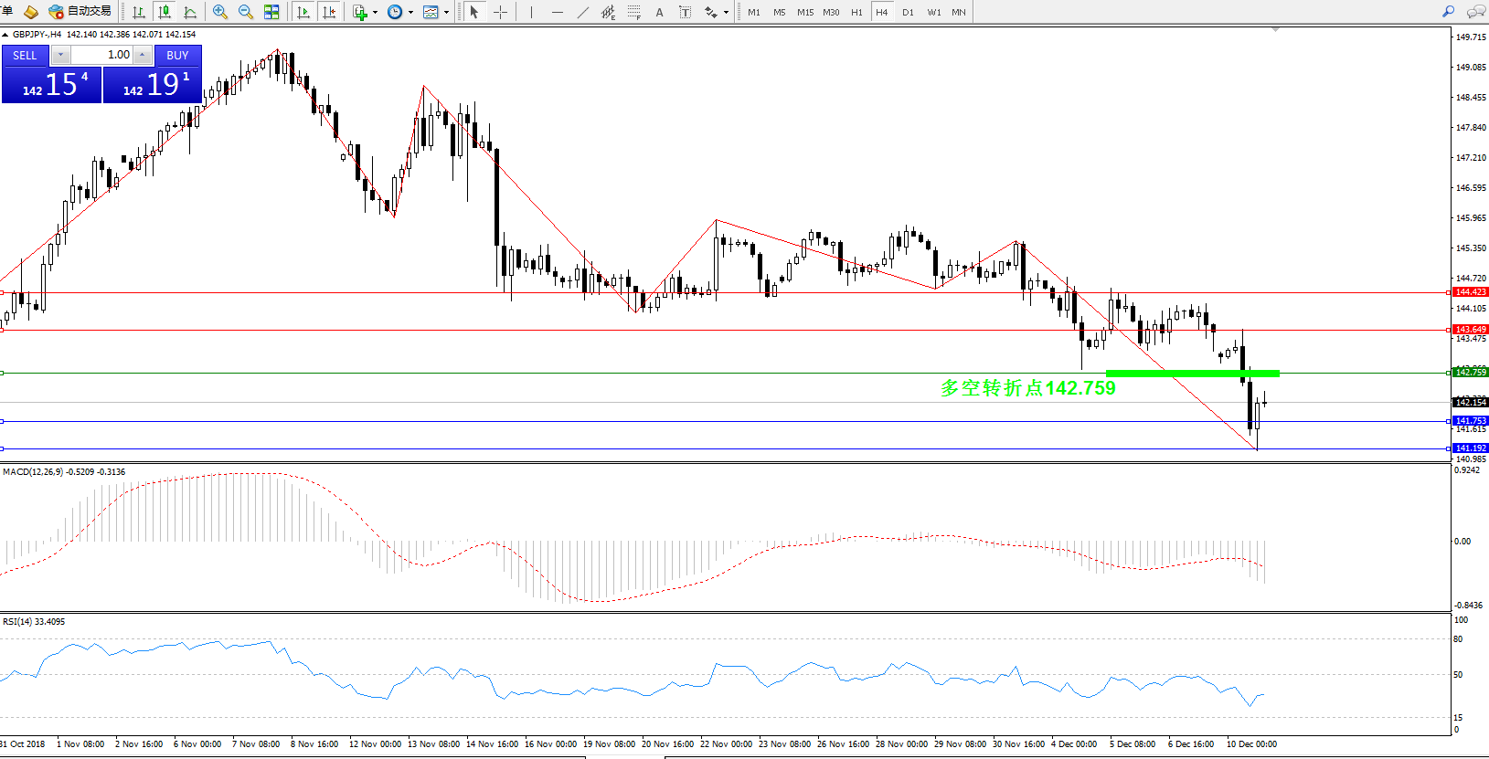 备选策略:142.759下方看跌,目标141.753、141.192