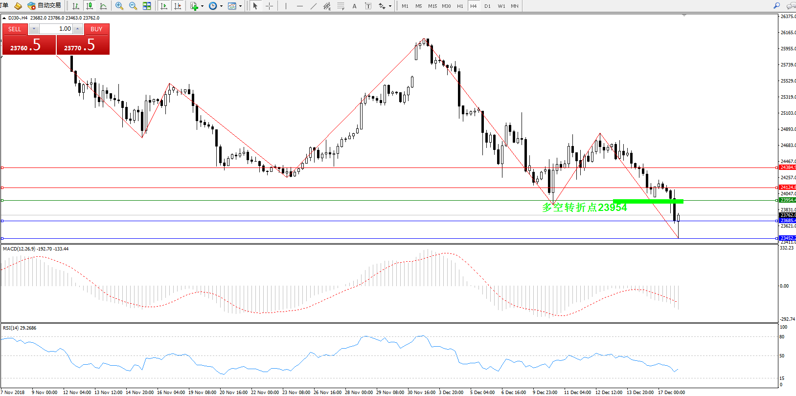 道琼斯指数DJ30—— 4小时K线图显示: