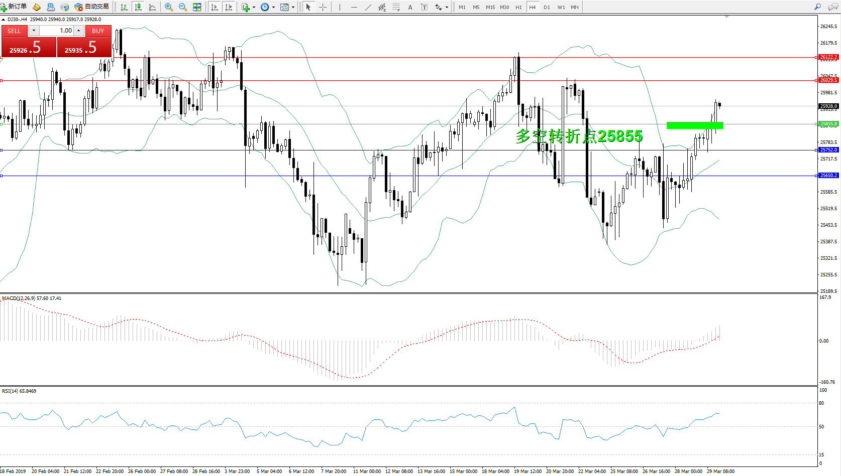 道琼斯指数DJ30—— 4小时K线图显示: