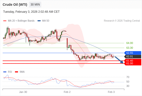 交易策略: 在 62.55 之下,看跌,目标价位为 61.40 ,然后为 61.00 。
