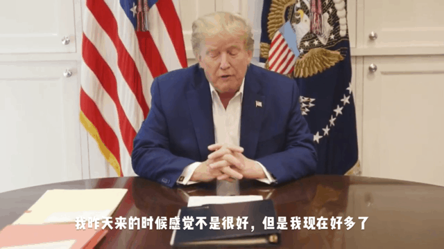 10月3号傍晚7点,特朗普发布了感染新冠后的第二支视频:我很好!虽然昨天我住院前感觉不是很好,但是现在好很多了。特朗普还开了个玩笑:梅拉尼娅也很好,你们知道她比我年轻一些,但只是一些些哦。