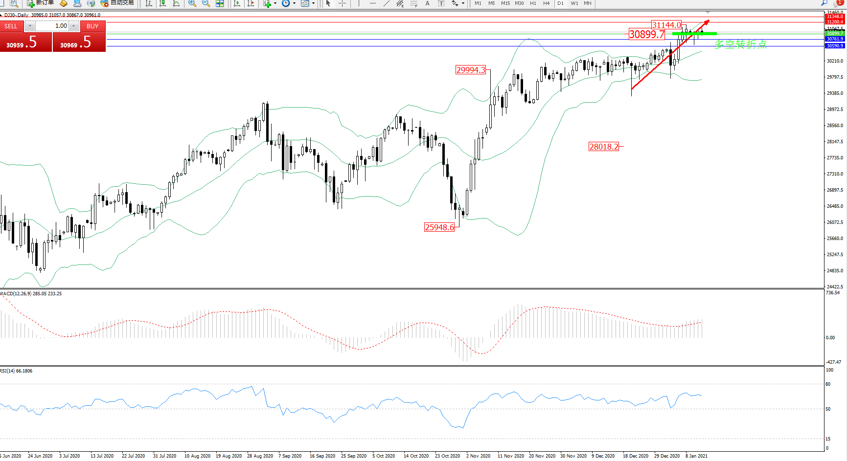 技术点评:多头动力延续布林带指标通道上轨附近弱势震荡向上移动中,高位抵达31144位置节点后出现整理回撤走势,布林带指标呈张口走势中,多头动力有继续拉升上扬态势,关注上轨附近关键节点,MACD指标处于0轴线上方多头区域维持整理平移后有向上移动迹象,RSI指标处于50均衡线上方多头区域维持震荡平移中;