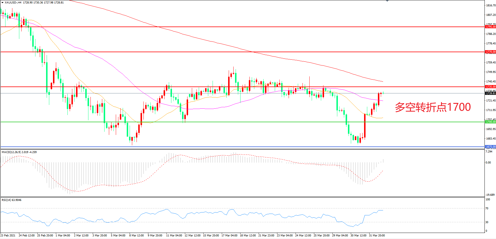 4小时图看,金价回踩1675后大幅反弹,1700关口被突破后,短期走势回暖,200周期均线成为上方阻力,1735成为短期多空分水岭,MACD红柱增加,RSI指标走平,日内震荡上行概率较大。