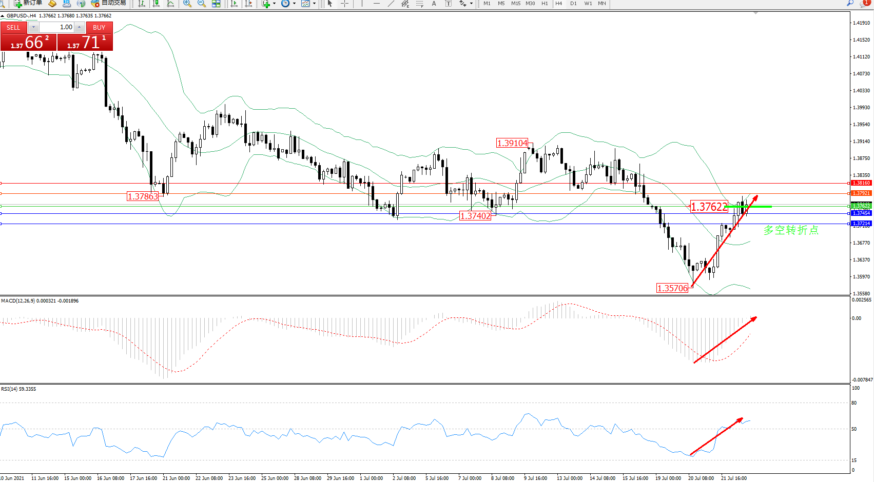 交易策略:1.37622上方看涨,目标1.37921、1.38160