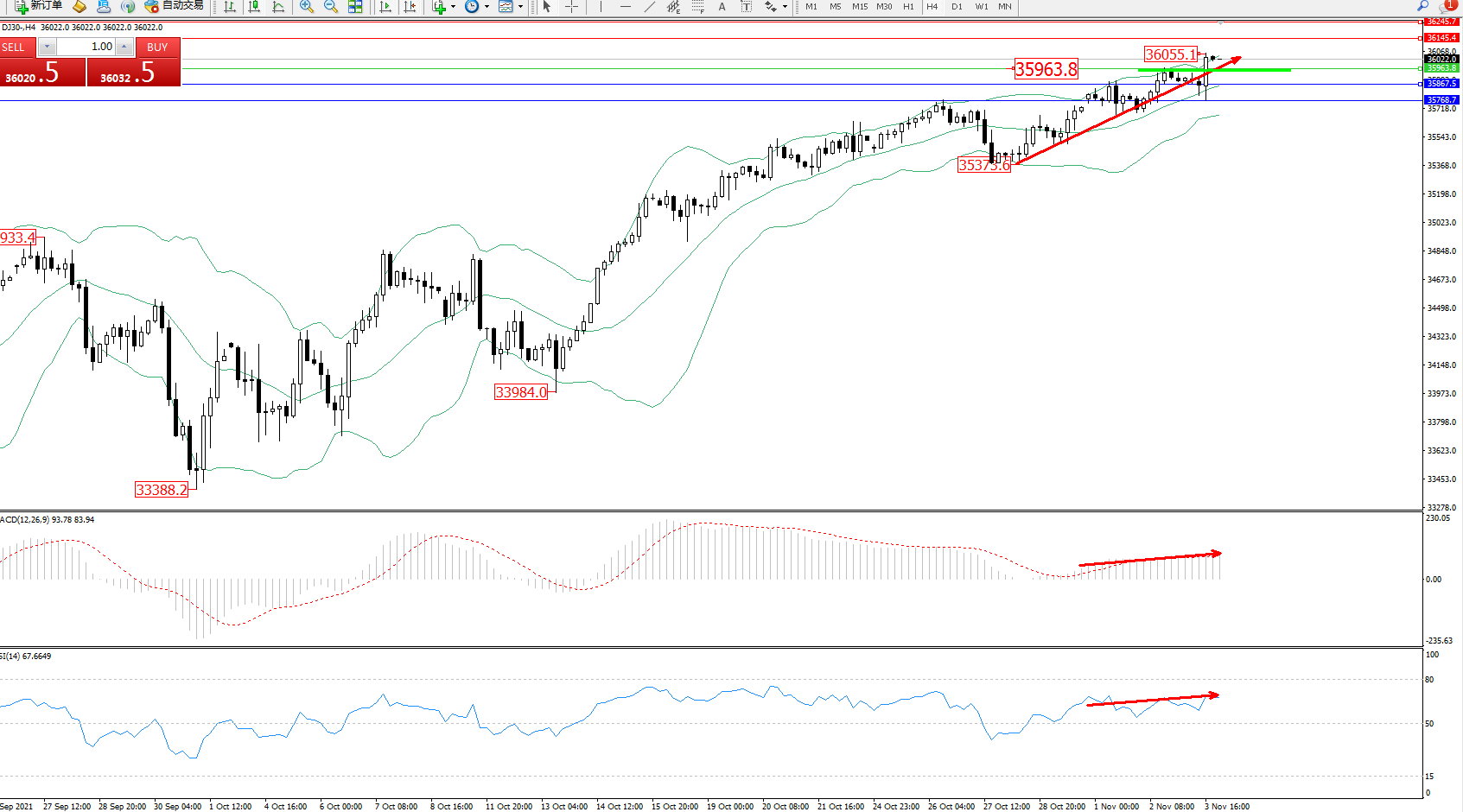 技术点评:多头动力延续布林带指标通道中上轨强劲持续震荡上扬,高位抵达36055位置节点后有继续上移迹象,布林带指标呈上行趋势走势态势良好,短期未见止步迹象,MACD指标处于多头区域维持整理平移,RSI指标处于多头区域维持窄整理中;