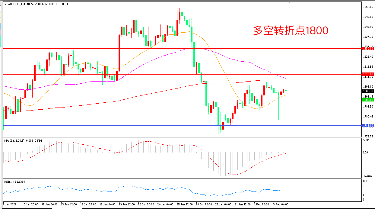 周四(2月3日),英国央行连续第二次会后加息并启动被动缩表后,欧洲央行又释放转向鹰派的重要信号,欧元兑美元刷新将近三周来高位,美指回落推动金价温和反弹,收报1806.13美元/盎司。但本周最重磅的数据无疑还是晚间公布的非农就业数据,如果非农就表现不佳,金价将受到更多支撑。