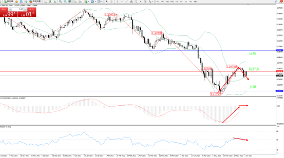 低位多头动力强势震荡上扬,触及延续布林带指标上轨持续上移至1.26706附近震荡,短期回撤至中轨附近整理,布林带指标呈张口走势后开始收口,上方压制关注1.29673附近节点,低位支撑关注1.22143附近节点,关注1.25760附近转折点,MACD指标处于空头区域低位震荡上移至0轴线附近徘徊,RSI指标处于50均衡线附近窄幅整理,如图: