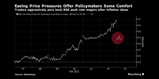 对利率最敏感的债券,2年期国债收益率下跌多达15个基点至3.65%。此前公布的数据显示,英国通胀率连续第3个月放缓,导致交易员下调了本轮加息峰值利率的预期,从4.69%降至4.53%。