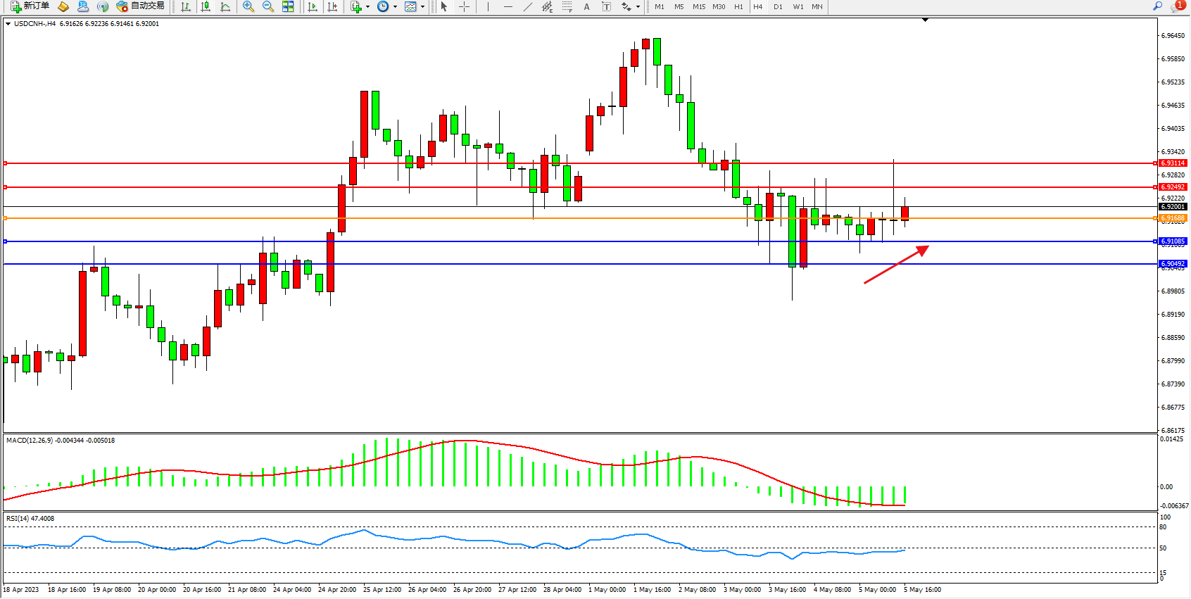 美元人民币USDCNH——4小时K线图显示: