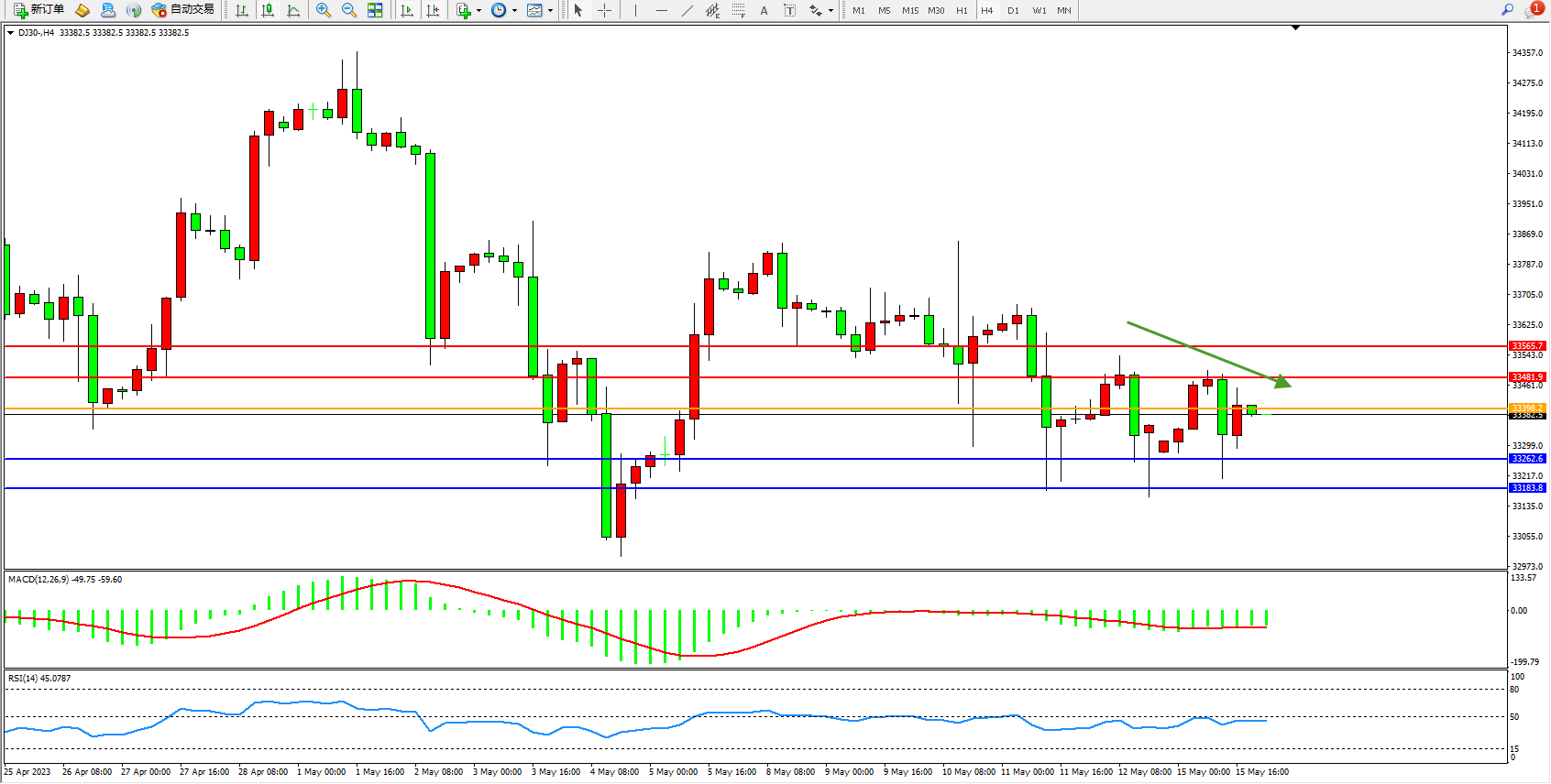 交易策略:33398下方看跌,目标33262  33183